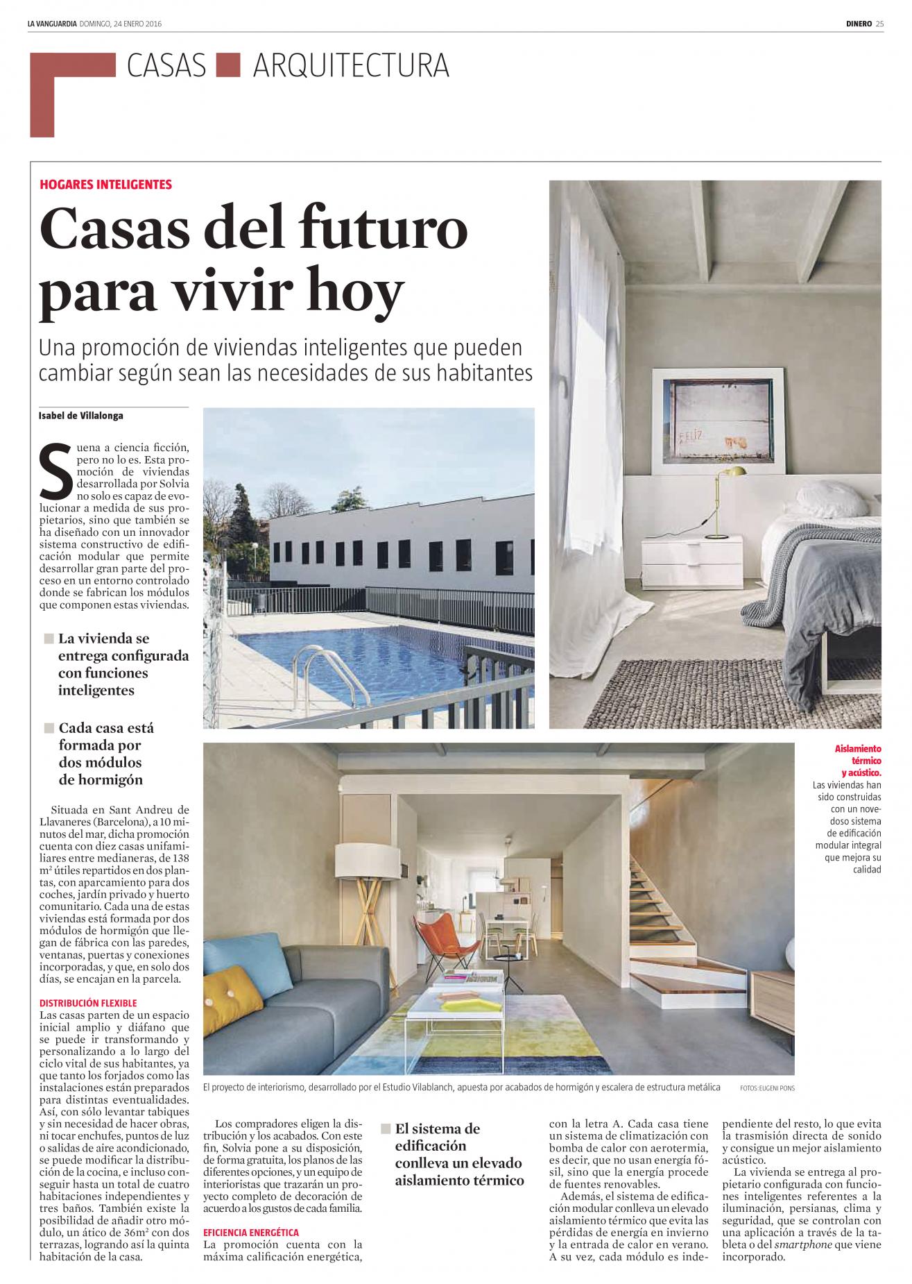 Sota el títol "Cases del futur per viure avui", La Vanguardia dedica un article de la secció Cases-Arquitectura al projecte d'interiorisme realitzat per l'estudi vilablanch per a la promoció d'habitages intel·ligents de Solvia a Sant Andreu de Llavaneres.