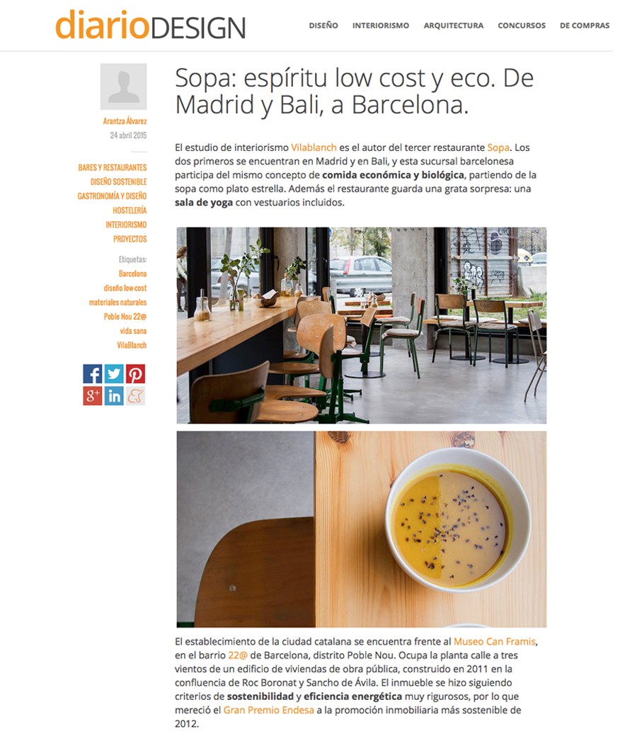 El magazine on-line DiarioDESIGN publica nuestro proyecto de arquitectura interior del restaurante Sopa, situado en el barrio 22@ de Barcelona, frente al Museo Can Framis.
